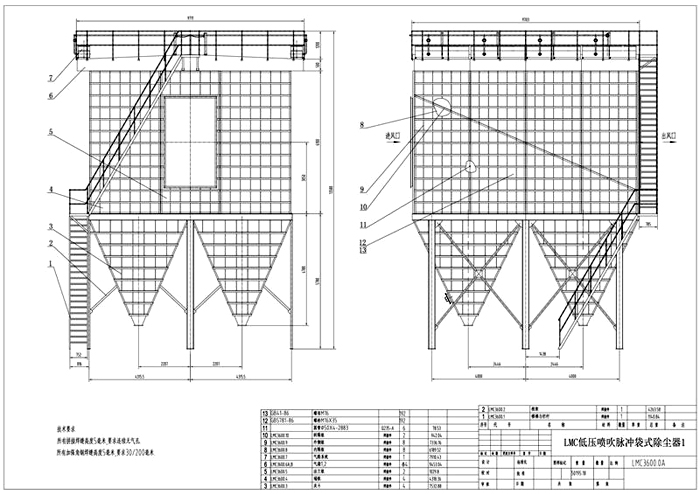(1)鑄造廠電爐布袋除塵器 結(jié)構(gòu) 點 除塵器中部箱體為園形筒狀結(jié)構(gòu),設(shè)計壓力0.25MPa,材質(zhì)為Q345R,板厚14mm以上。其上設(shè): 檢修人孔。 箱體設(shè)氮氣吹掃系統(tǒng),用于qingchu積聚的灰塵和筒體煤氣置換吹掃; 高爐布袋除塵器 高爐布袋除塵器(2張) 儀表壓縮空氣系統(tǒng),用于閥門控制;設(shè)人工灰塵檢測口,方便取樣化驗。 懸掛式箱體支座。煤氣進口接管設(shè)相應(yīng)導(dǎo)流配氣裝置。 高爐布袋除塵器頂部采用符合/T4746-2002標(biāo)準(zhǔn)要求的正橢圓形封頭,壁厚16mm以上,材質(zhì)Q345R。凈煤氣從箱體頂部接出,在封頭上設(shè)有anquan閥及放散管。 高爐布袋除塵器下部采用錐形灰斗,材質(zhì)Q345R,板厚14mm以上,錐形灰斗錐角為50°,確保灰塵順利排出。下錐體上設(shè)雙路蒸汽保溫盤管防止煤氣結(jié)露和粉塵結(jié)塊而影響排灰。灰斗上下高低灰位各設(shè)一個熱電阻檢測灰斗的灰位,并設(shè)有倉壁震動器兩套和氮氣吹掃管。 除塵器進、出口管道分別設(shè)置全封閉式電動插板閥、氣動三偏心蝶閥、大拉桿波紋補償器、手孔。